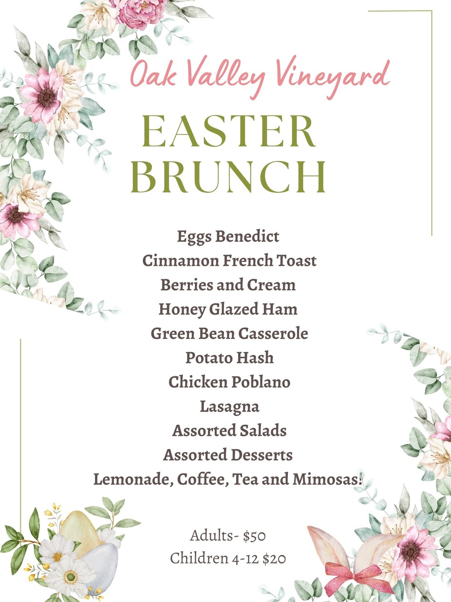 Come celebrate Easter with us! We are taking reservation's for our 10:30 to 11:00 am seating and our 12:30 to 1:00 pm seating $25 deposit to reserve your table. Adults are $50 pp and children 3 to 12 years old are $20. Easter egg Hunt at 12pm! Drinks and mimosa's included.